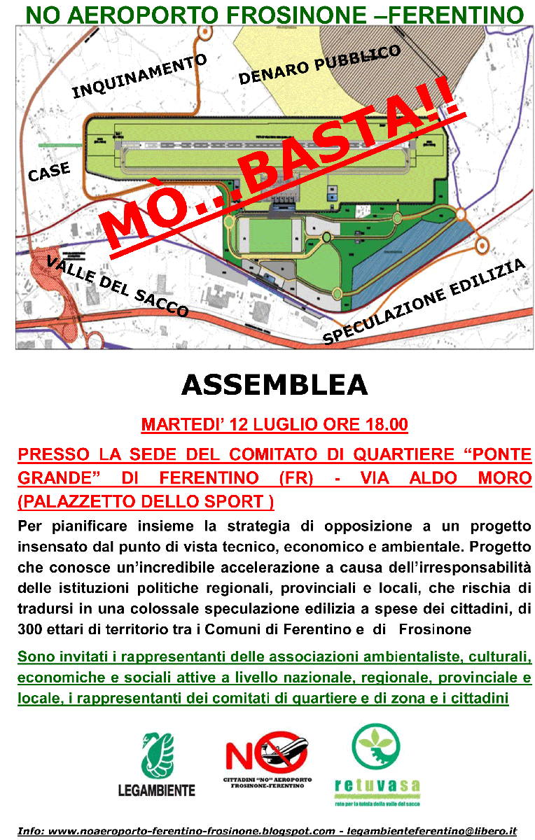 Per pianificare insieme la strategia di opposizione a questa inutile infrastruttura è convocata un’assemblea pubblica martedì 12 luglio alle ore 18, presso la sede del comitato di quartiere “ Ponte Grande ” di Ferentino , in via Aldo Moro (Palazzetto dello sport).